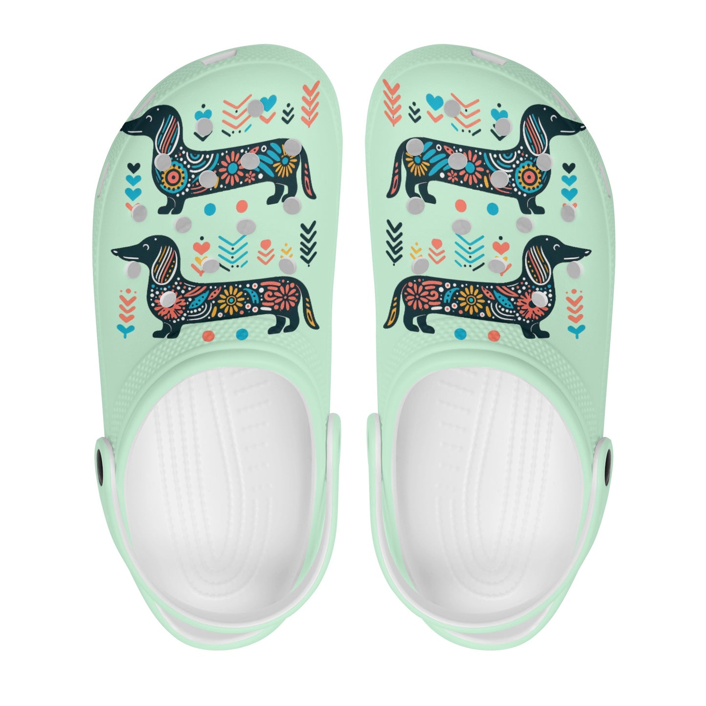 Si eres un amante de los perros salchicha, adorarás estos zuecos personalizados con estampados integrales que presentan encantadoras imágenes de perros salchicha. Estos zuecos no sólo están de moda, sino también cómodos y funcionales. Están hechos de material EVA de alta calidad que es flexible y duradero, y tienen un estilo redondeado y orificios de ventilación para mayor diversión y transpirabilidad. La correa del talón pivotante le permite ponérselos y quitárselos fácilmente y también proporciona un ajuste más seguro. La técnica de impresión por sublimación garantiza colores vibrantes e ideas creativas que harán que tus zuecos destaquen. Ya sea que los uses en casa, en el jardín o en el trabajo, estos zuecos mantendrán tus pies cómodos y tu amor por el perro salchicha fuerte. Para mantenerlos en buenas condiciones, simplemente lávelos a mano en agua fría y séquelos al aire. ¡Pide el tuyo hoy y disfruta de los elogios de otros fanáticos de los perros salchicha!