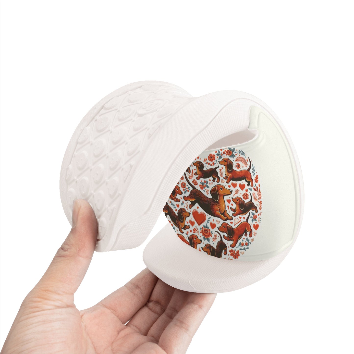 These sandals feature a rubber fabric upper that can be personalized with your favorite dachshund design. Whether you prefer smooth, wirehaired, or longhaired dachshunds, or a variety of colors and patterns, you can create your own unique pair of sandals that reflect your style and personality.