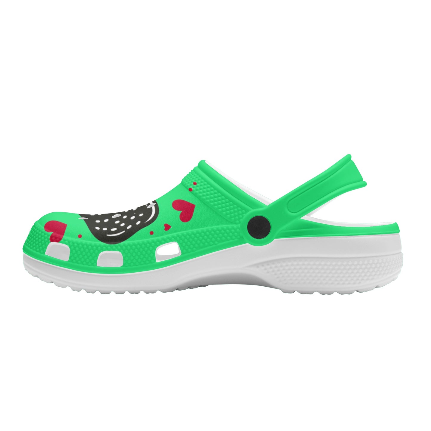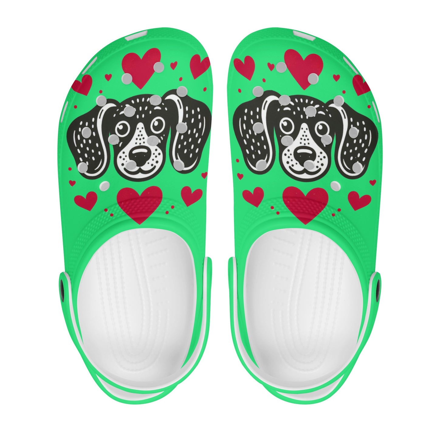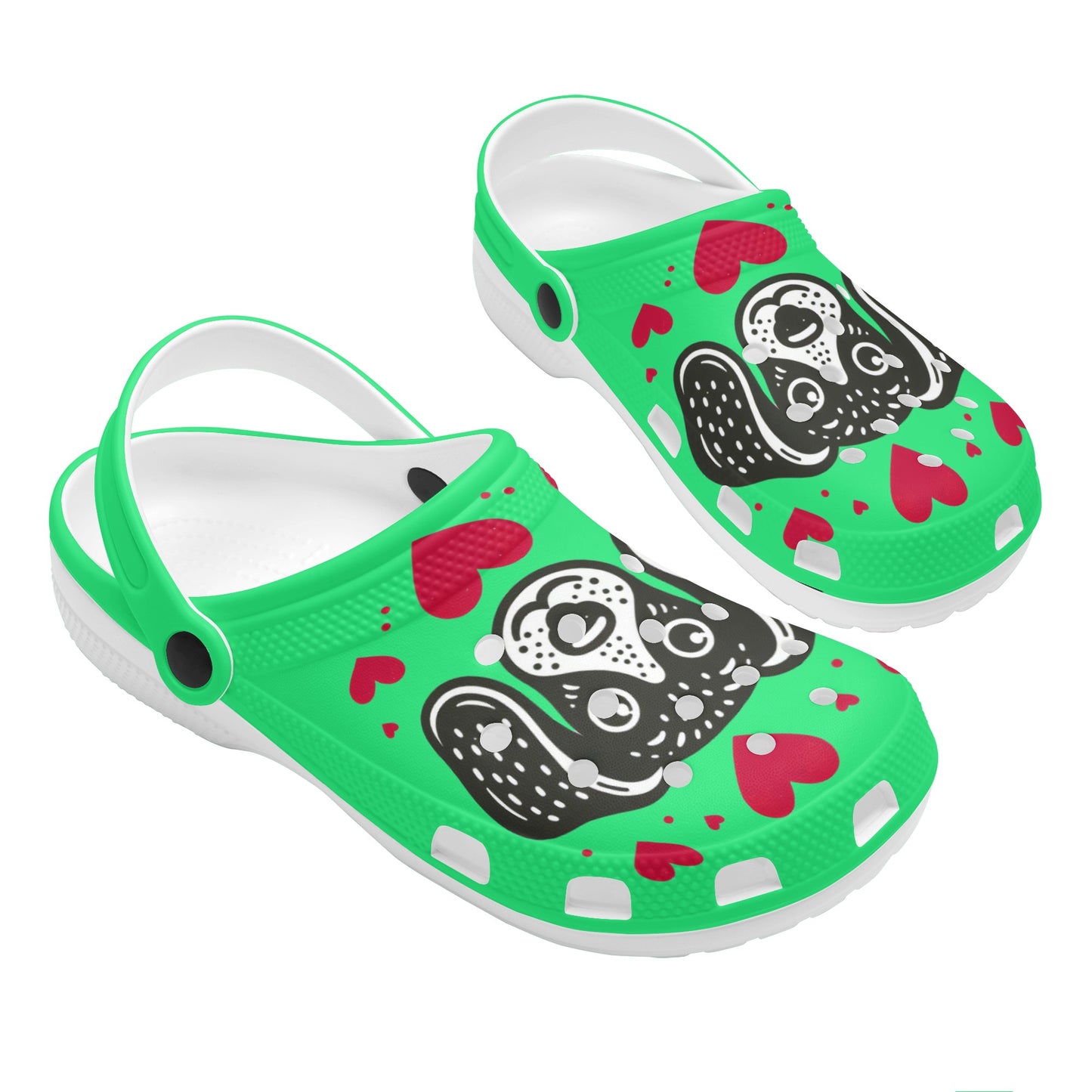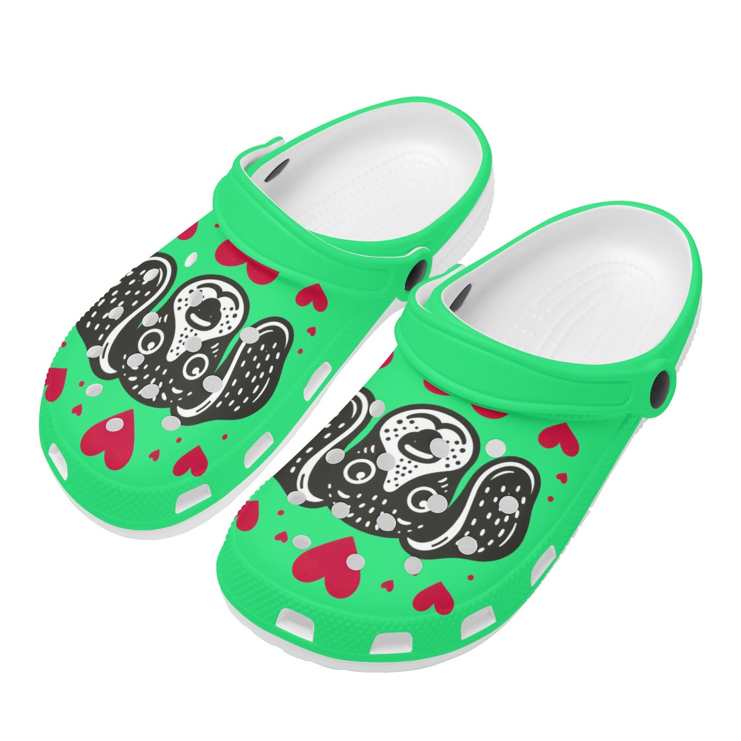 If you are a dachshund lover, you will adore these custom all over printed clogs that feature charming dachshund images. These clogs are not only fashionable, but also comfortable and functional. They are made of high quality EVA material that is flexible and durable, and they have a rounded style and vent holes for added fun and breathability. The pivoting heel strap allows you to easily slip them on and off, and also provides a more secure fit. The sublimation printing technique ensures vibrant colors and creative ideas that will make your clogs stand out. Whether you wear them at home, at the garden, or at work, these clogs will keep your feet cozy and your dachshund love strong. To keep them in good condition, simply hand wash them in cold water and air dry them. Order yours today and enjoy the compliments from fellow dachshund fans!
