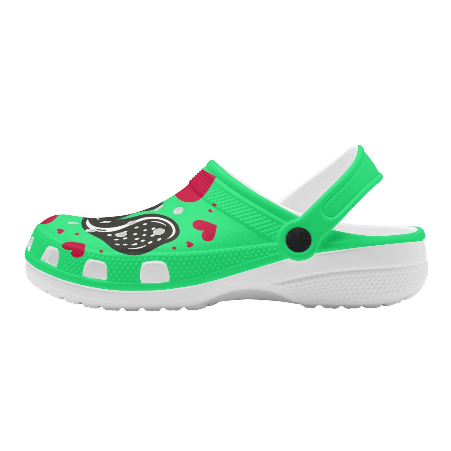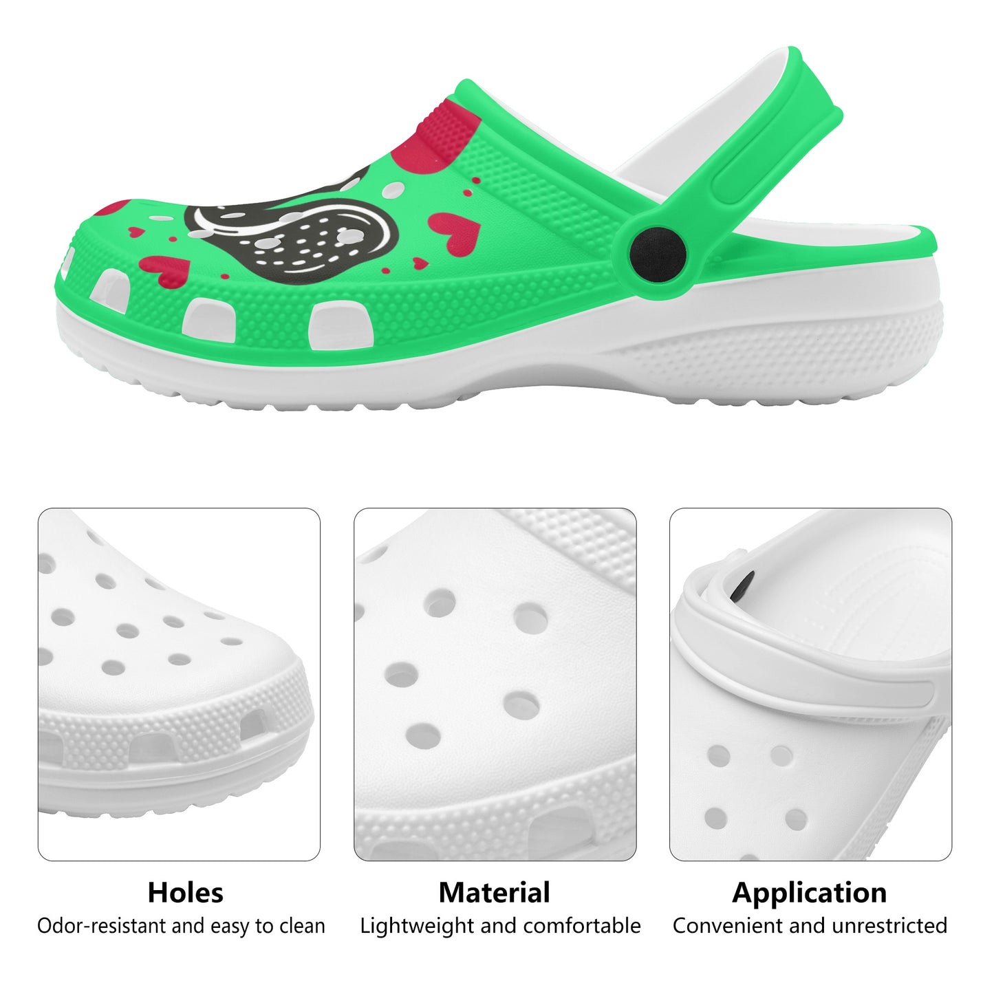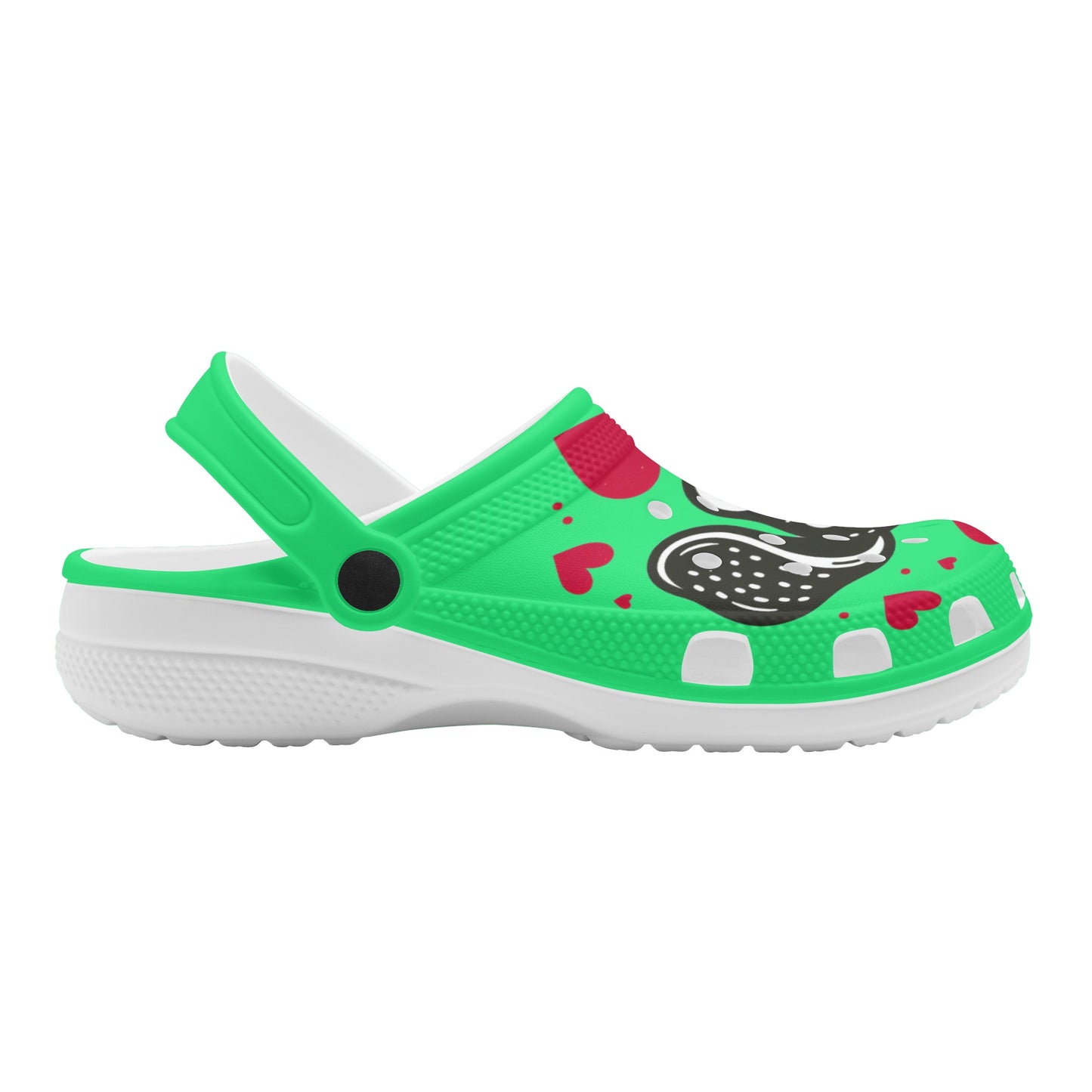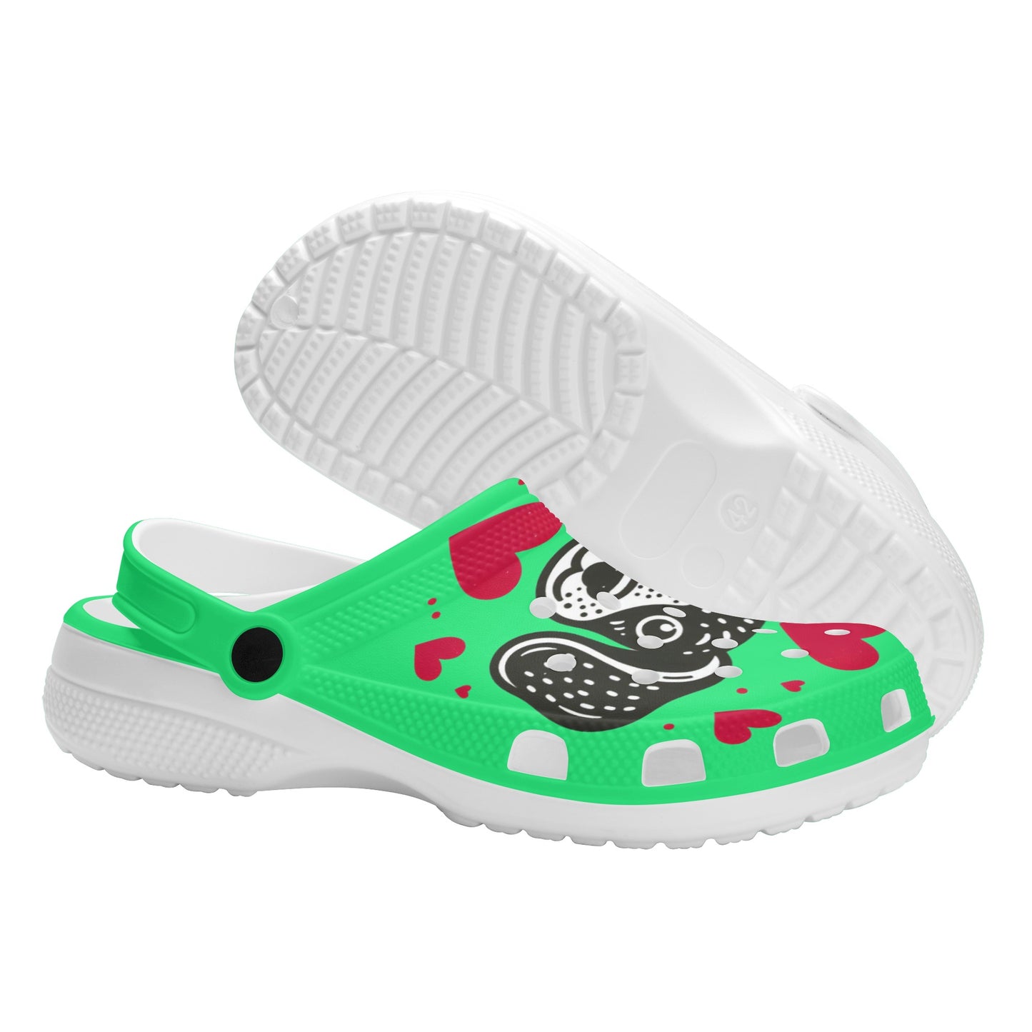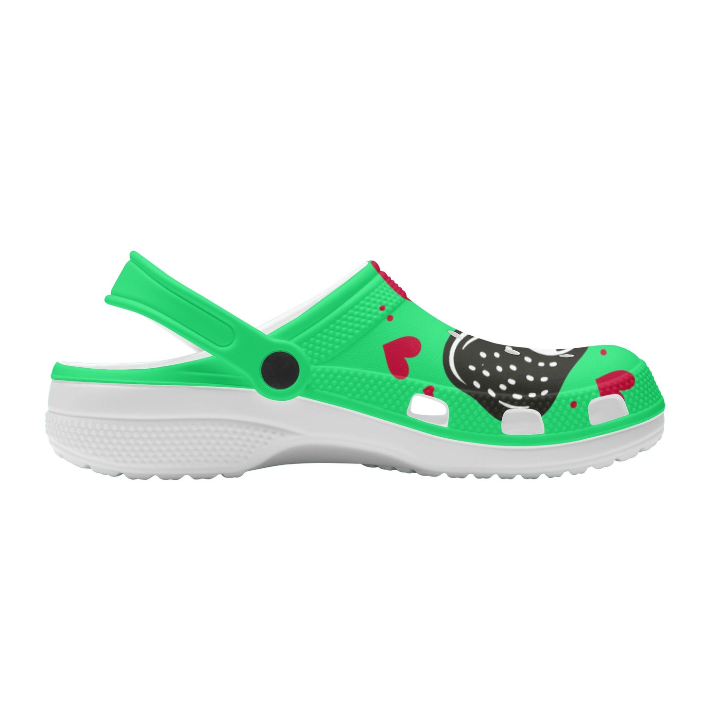 If you are a dachshund lover, you will adore these custom all over printed clogs that feature charming dachshund images. These clogs are not only fashionable, but also comfortable and functional. They are made of high quality EVA material that is flexible and durable, and they have a rounded style and vent holes for added fun and breathability. The pivoting heel strap allows you to easily slip them on and off, and also provides a more secure fit. The sublimation printing technique ensures vibrant colors and creative ideas that will make your clogs stand out. Whether you wear them at home, at the garden, or at work, these clogs will keep your feet cozy and your dachshund love strong. To keep them in good condition, simply hand wash them in cold water and air dry them. Order yours today and enjoy the compliments from fellow dachshund fans!