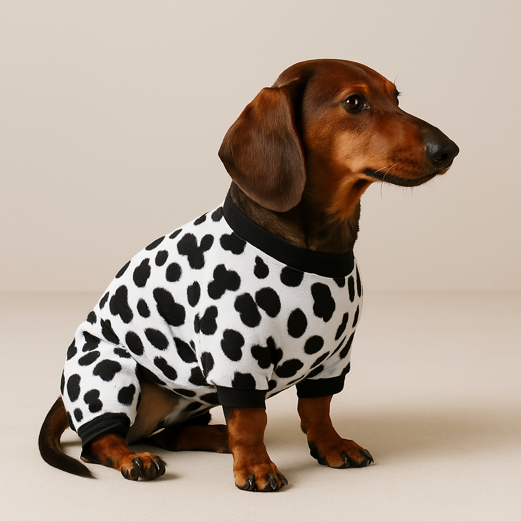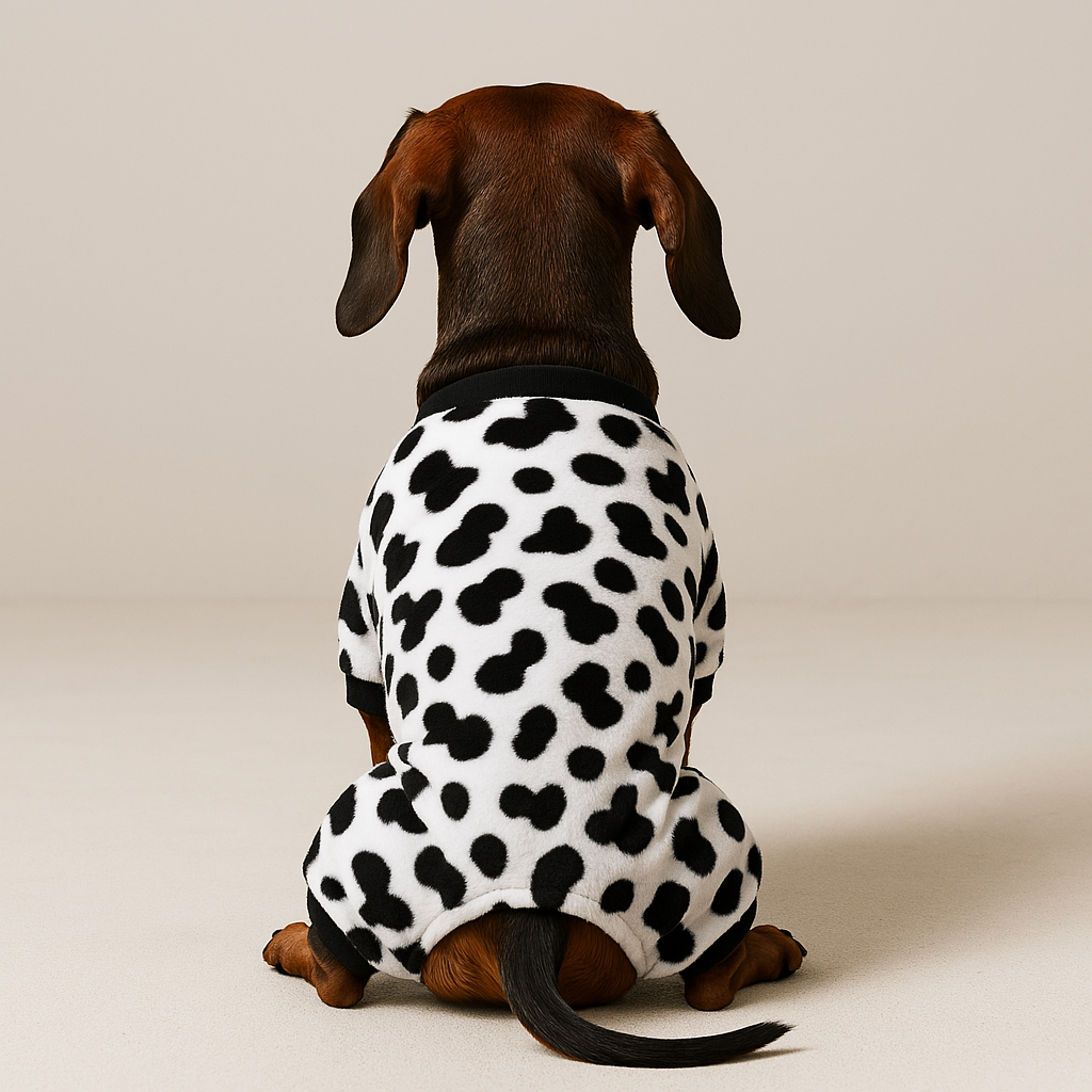 Playful Design: These white Fleece Doxie pajamas with charming black cow details aren’t just functional—they're incredibly cute! Your dachshund will turn heads and earn smiles wherever they go with this adorable look.