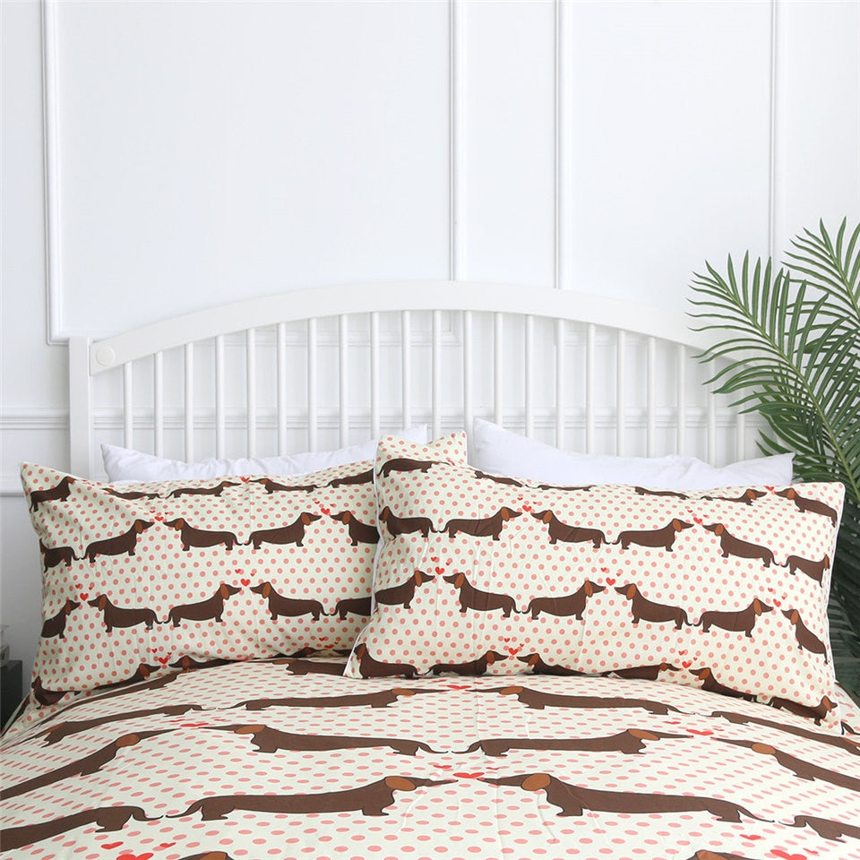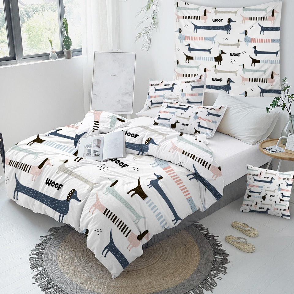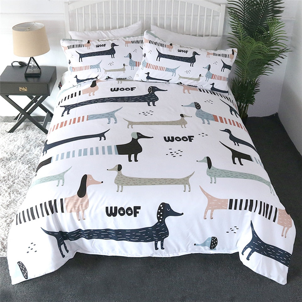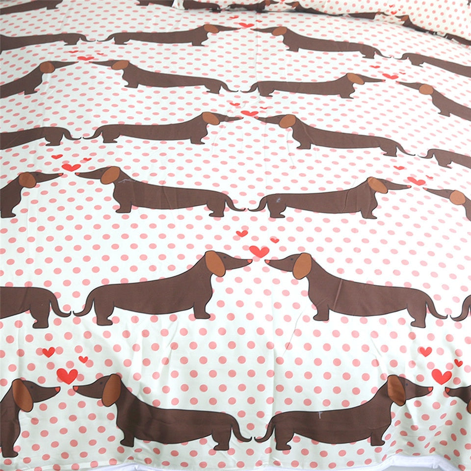 This Dog cartoon bedding set Microfiber has desirable properties such as super soft, breathing ability, reversible, wrinkle resistance, luxurious appearance, and easy cleaning. Easy to wash them in the washing machine or by hand. 3D Dog bedding highlights various dogs' breeds, and this cute dog design is great for Dachshund lovers. Our bedding sets are designed to offer you a different and sophisticated sleeping experience.