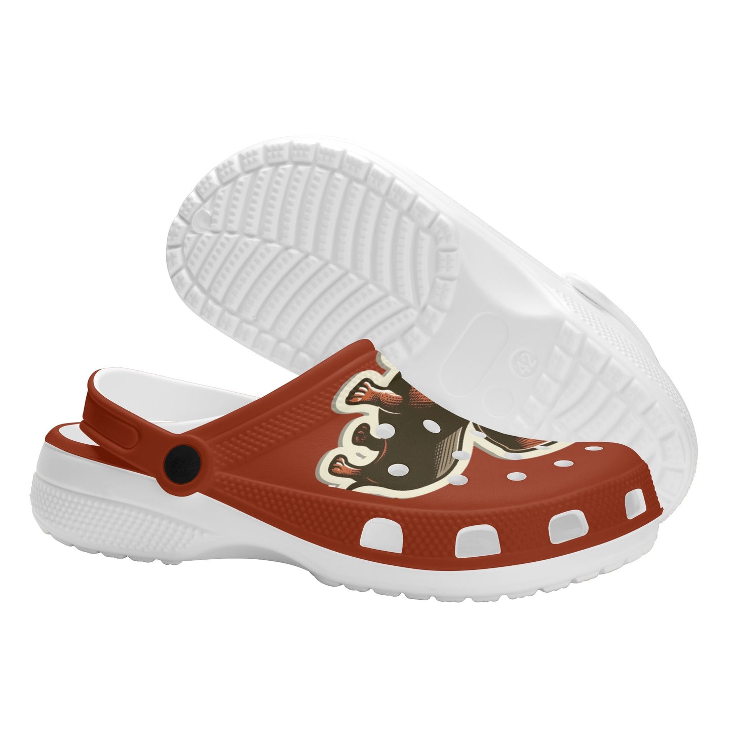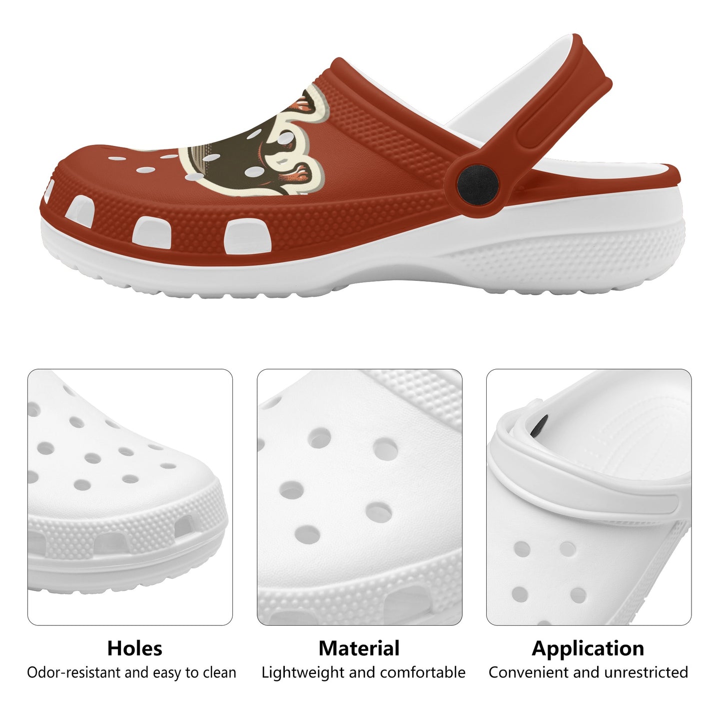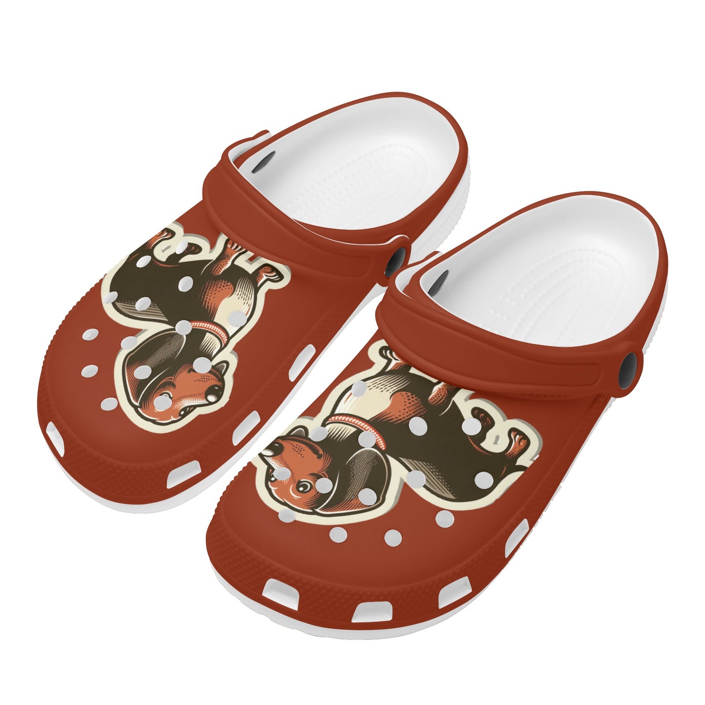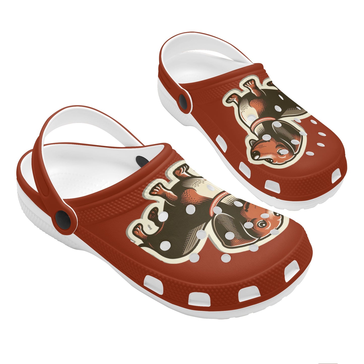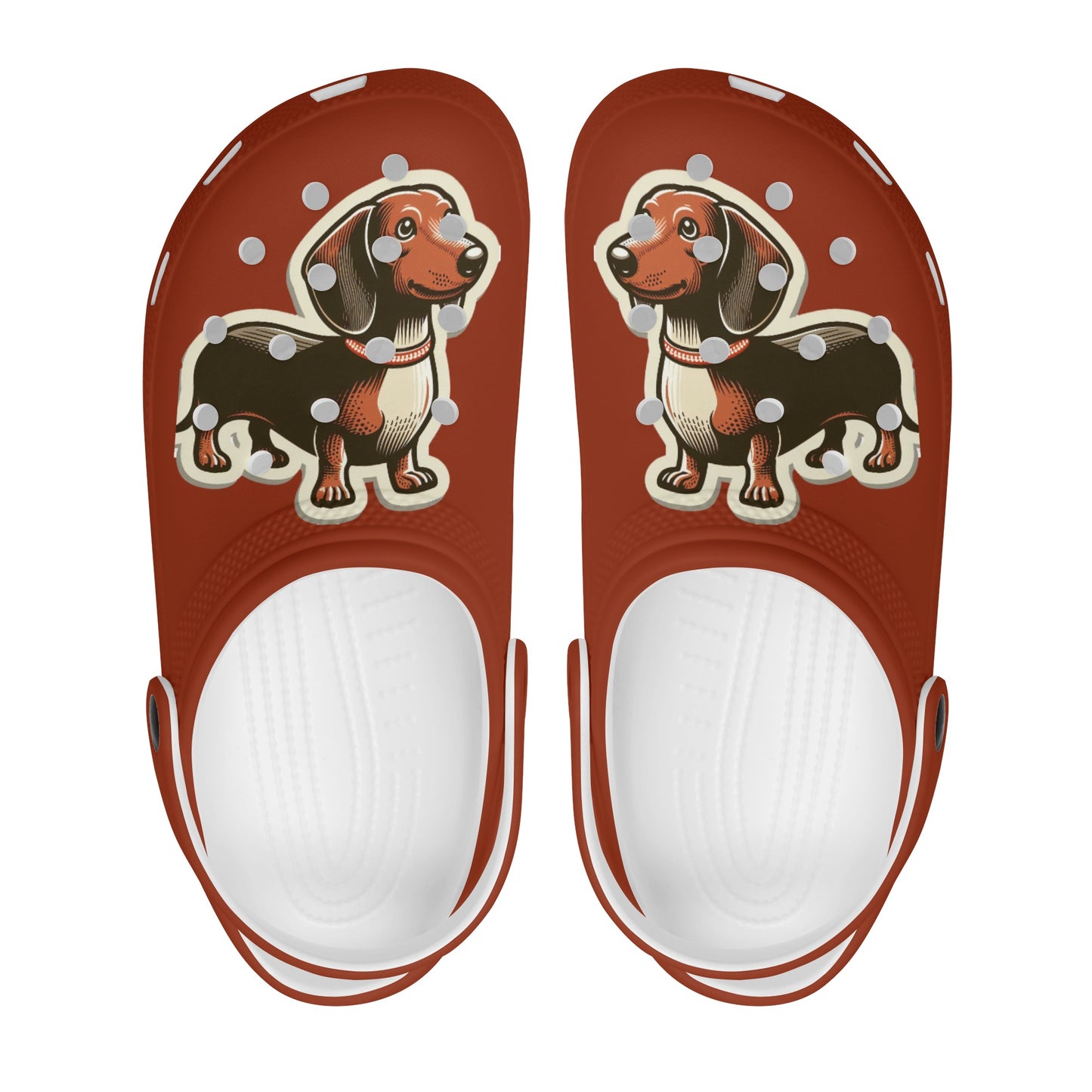 If you are a dachshund lover, you will adore these custom all over printed clogs that feature charming dachshund images. These clogs are not only fashionable, but also comfortable and functional. They are made of high quality EVA material that is flexible and durable, and they have a rounded style and vent holes for added fun and breathability. The pivoting heel strap allows you to easily slip them on and off, and also provides a more secure fit. The sublimation printing technique ensures vibrant colors and creative ideas that will make your clogs stand out. Whether you wear them at home, at the garden, or at work, these clogs will keep your feet cozy and your dachshund love strong. To keep them in good condition, simply hand wash them in cold water and air dry them. Order yours today and enjoy the compliments from fellow dachshund fans!