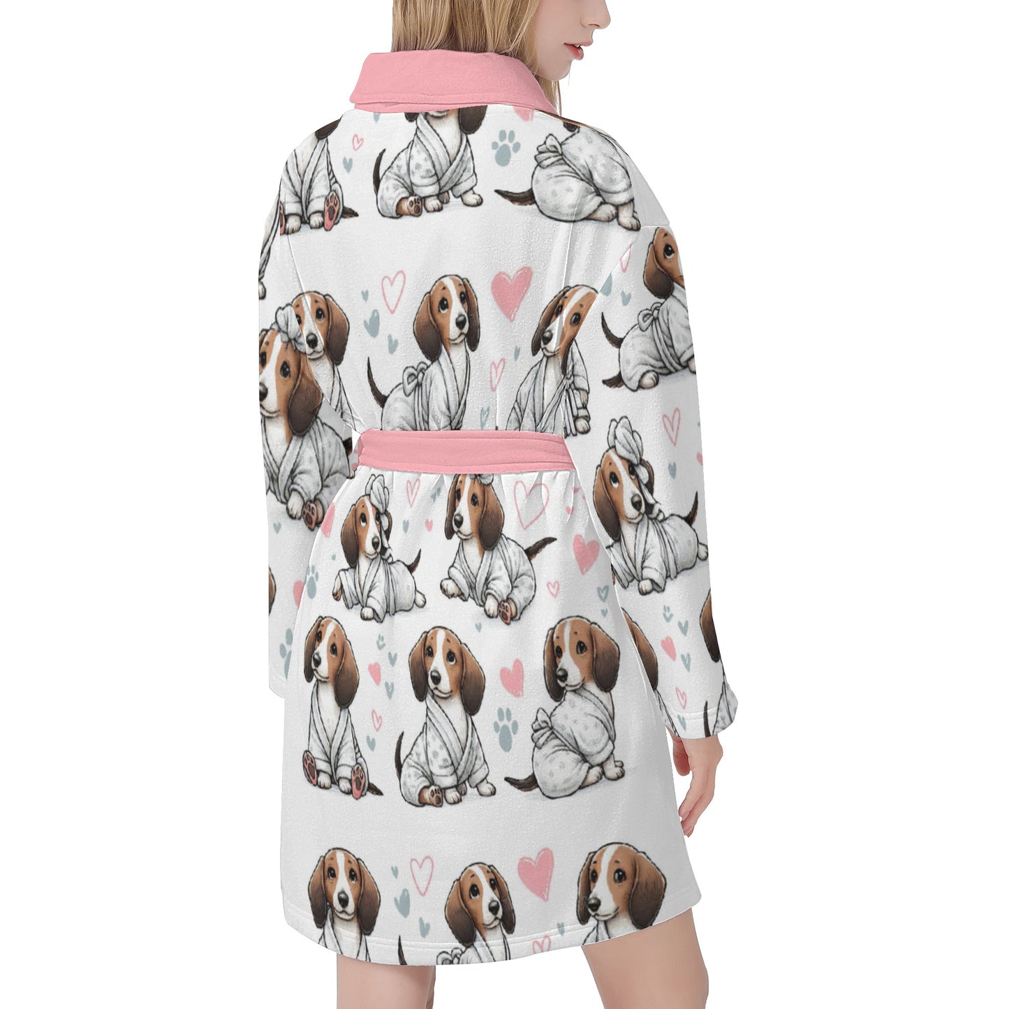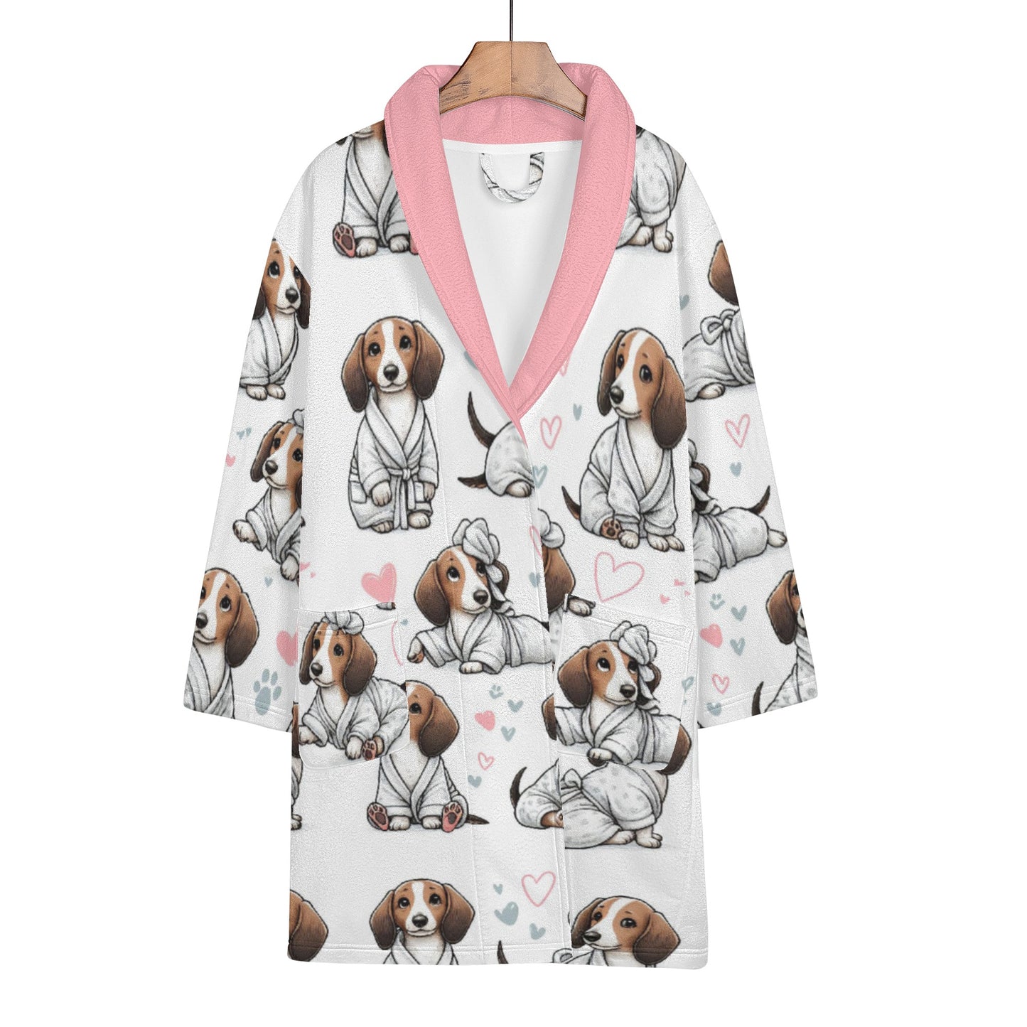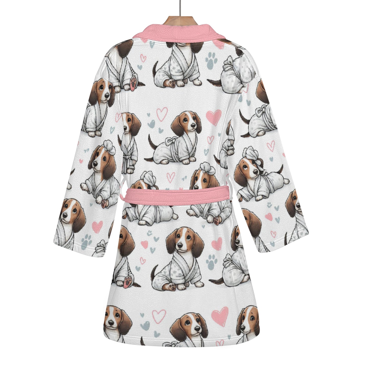 Wrap yourself in cozy comfort with this adorable dachshund lovers bathrobe. This bathrobe features a cute pattern of dachshunds in various colors and poses, perfect for any dog lover.