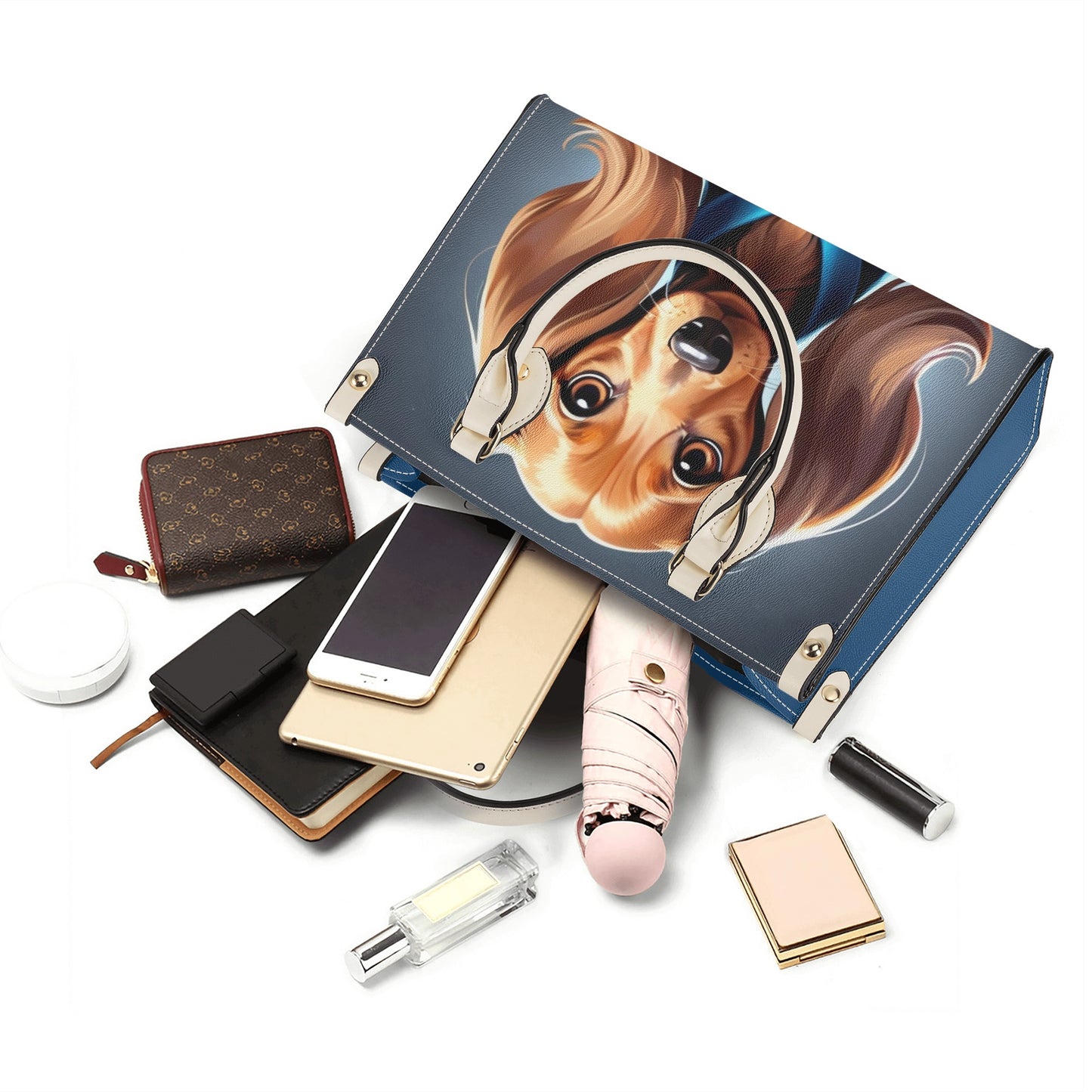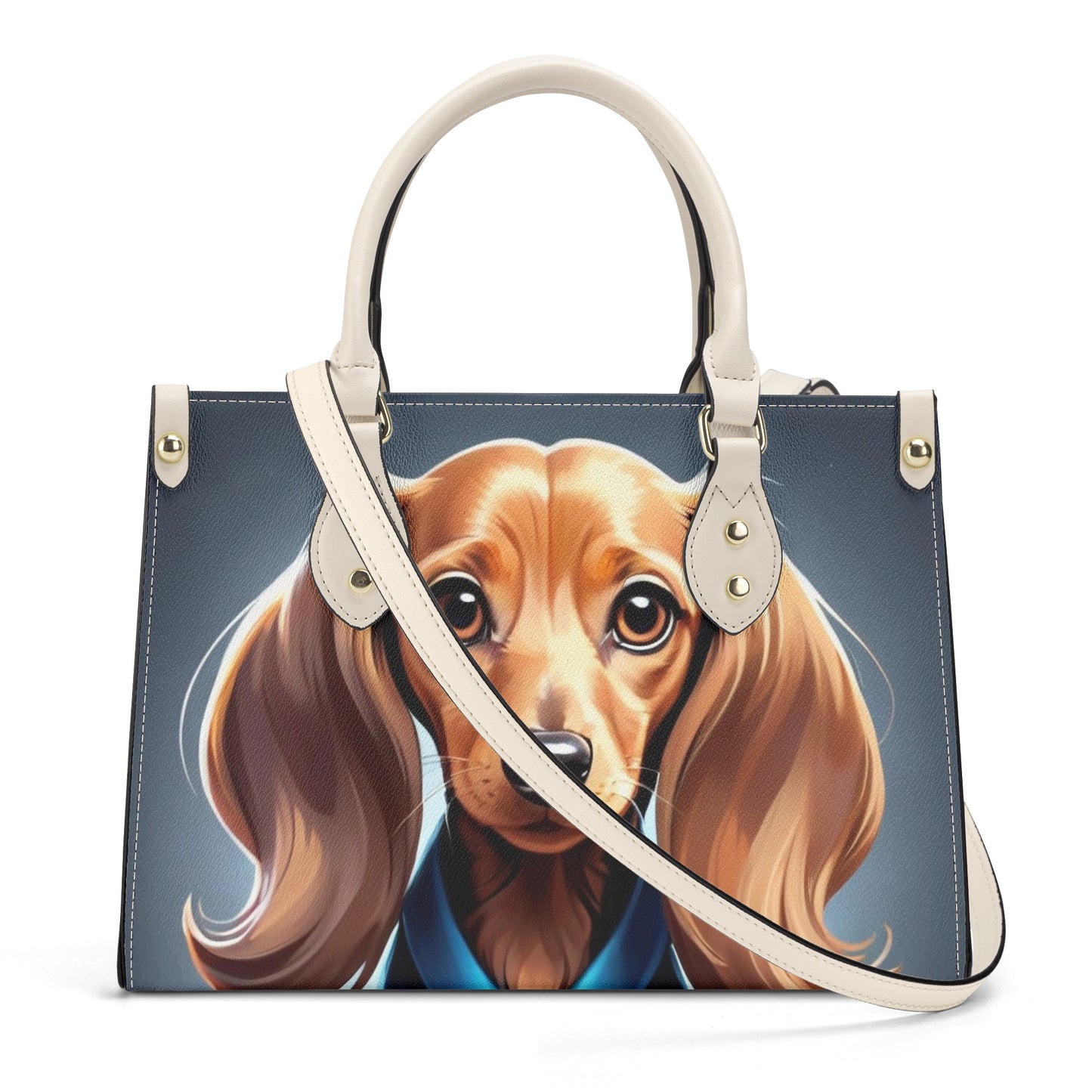 - This handbag is made of high-quality PU leather, which is durable, water-resistant, and easy to clean. It features a smooth zipper and an all over printing customized style, with a charming dachshund pattern that will make you smile every time you look at it. The main compartment design with two top handles maintains balance and allows you to carry your essentials with ease. The handbag also has one inside pocket with a sewn-in and non-removable shoulder strap, which gives you more options to wear it as a crossbody or a shoulder bag. The white and black color scheme is versatile and elegant, and it can match different outfits and occasions.