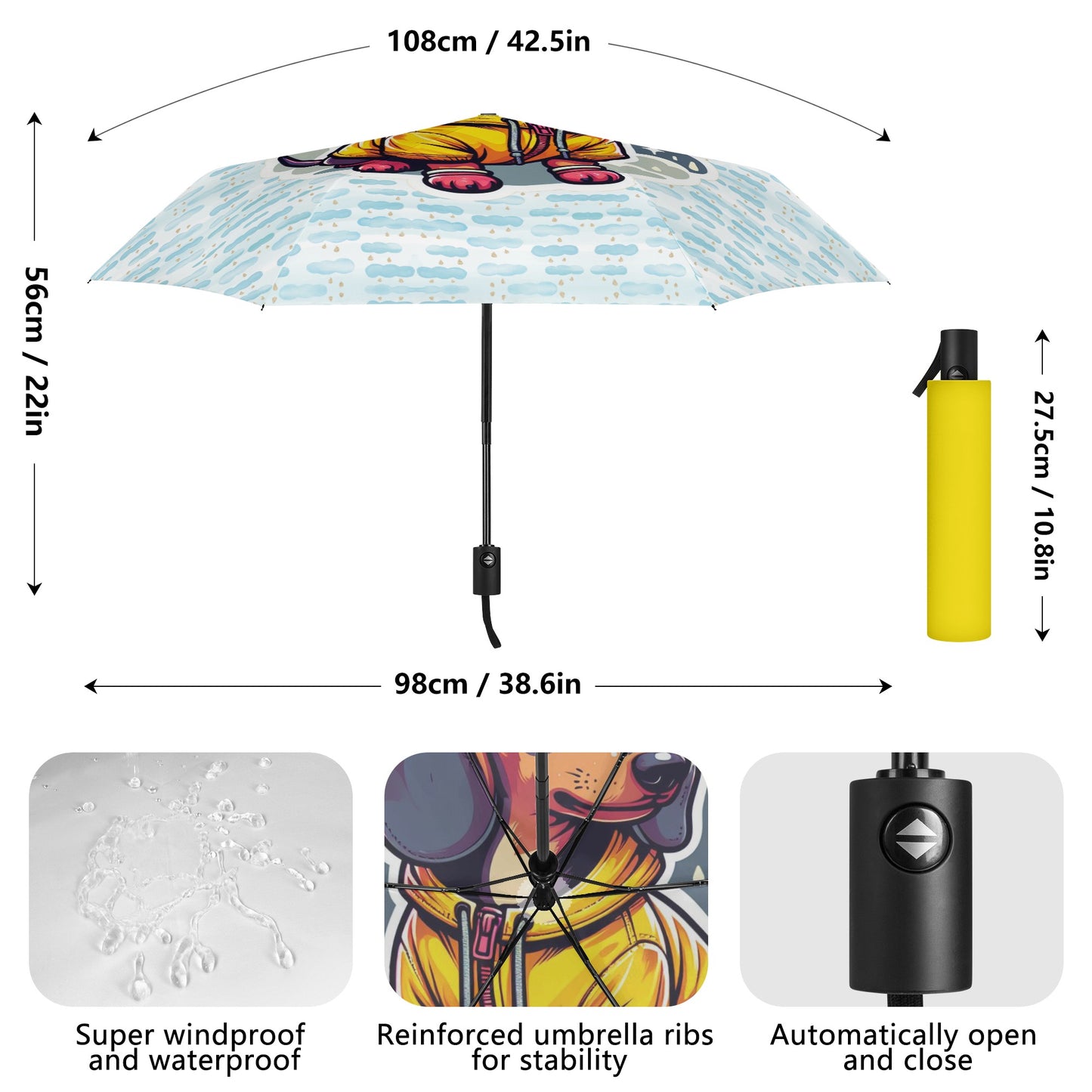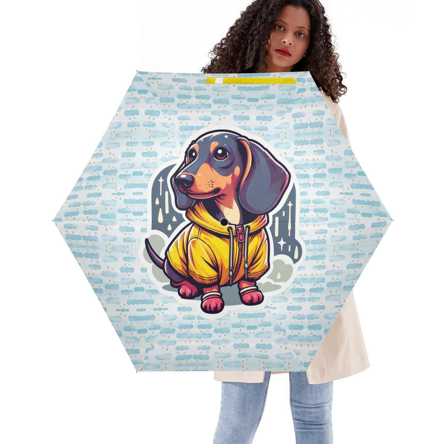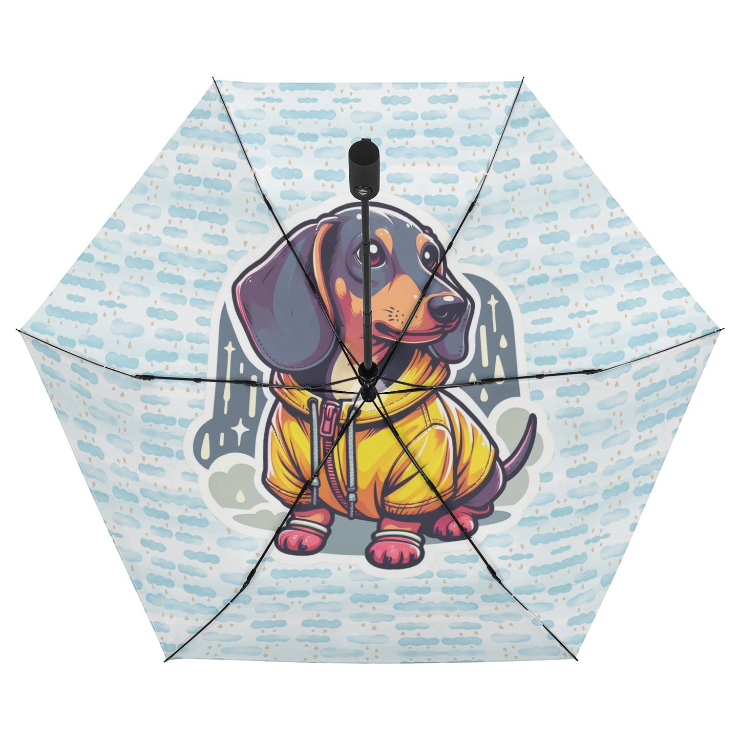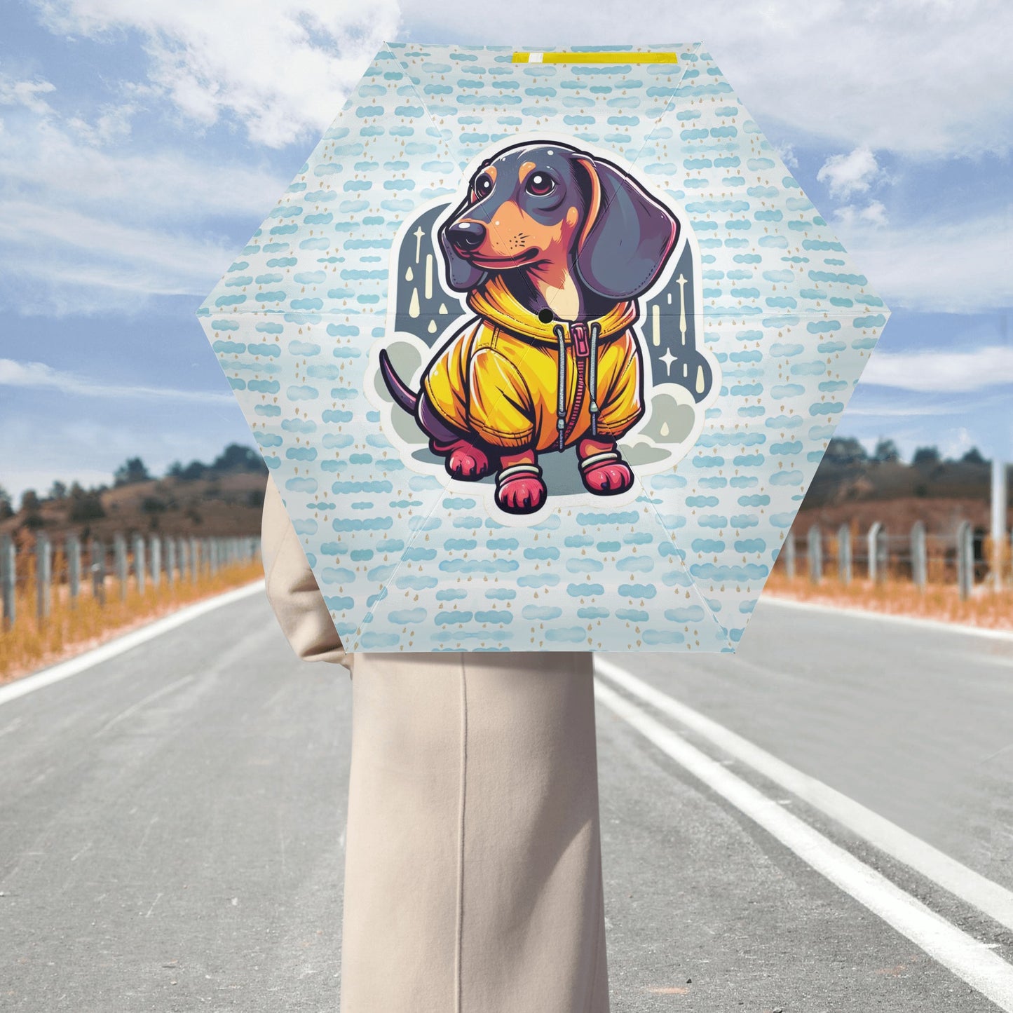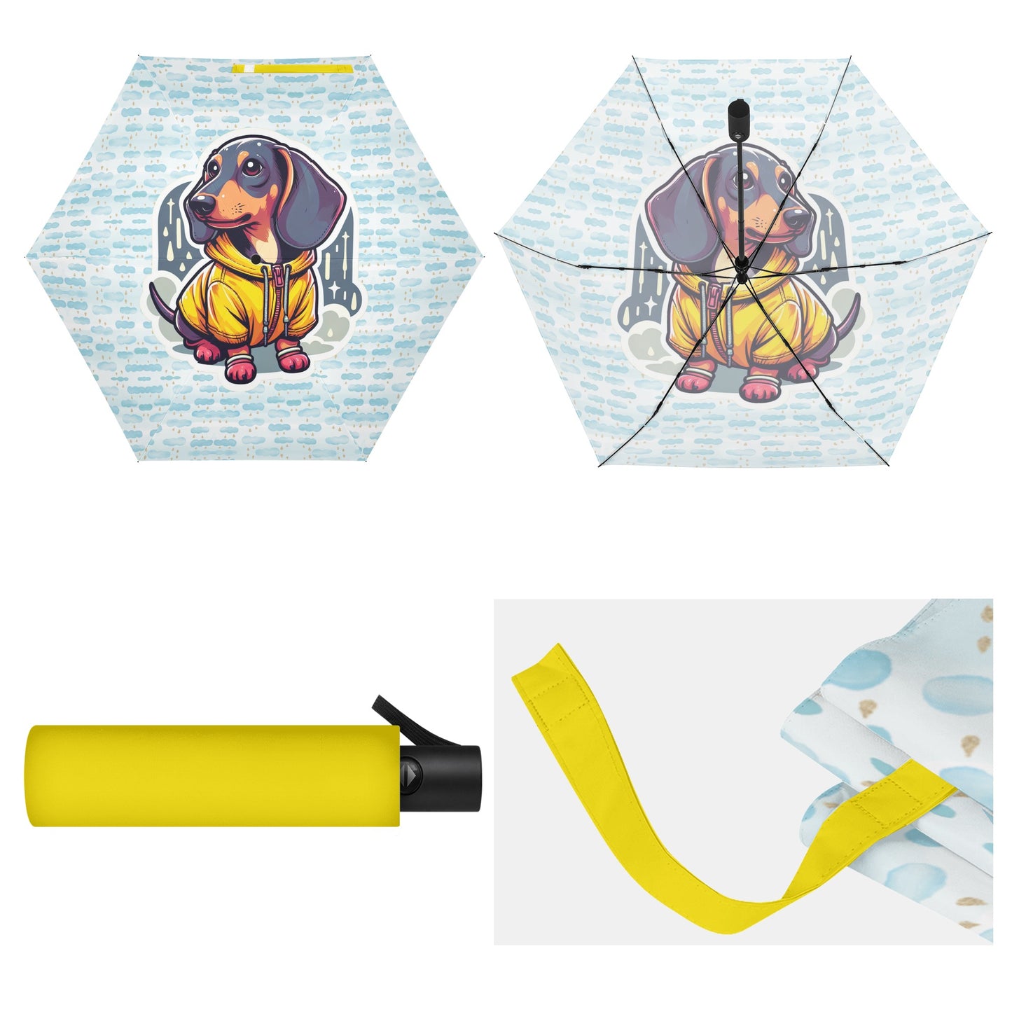 The umbrella is made up of 6 pieces, each featuring a cute dachshund print. You can also customize the belt and cover to match your style and preference. The umbrella has an automatic open and close mechanism, and a comfortable grip handle. You can open and close it with one hand, and enjoy a smooth and convenient experience.