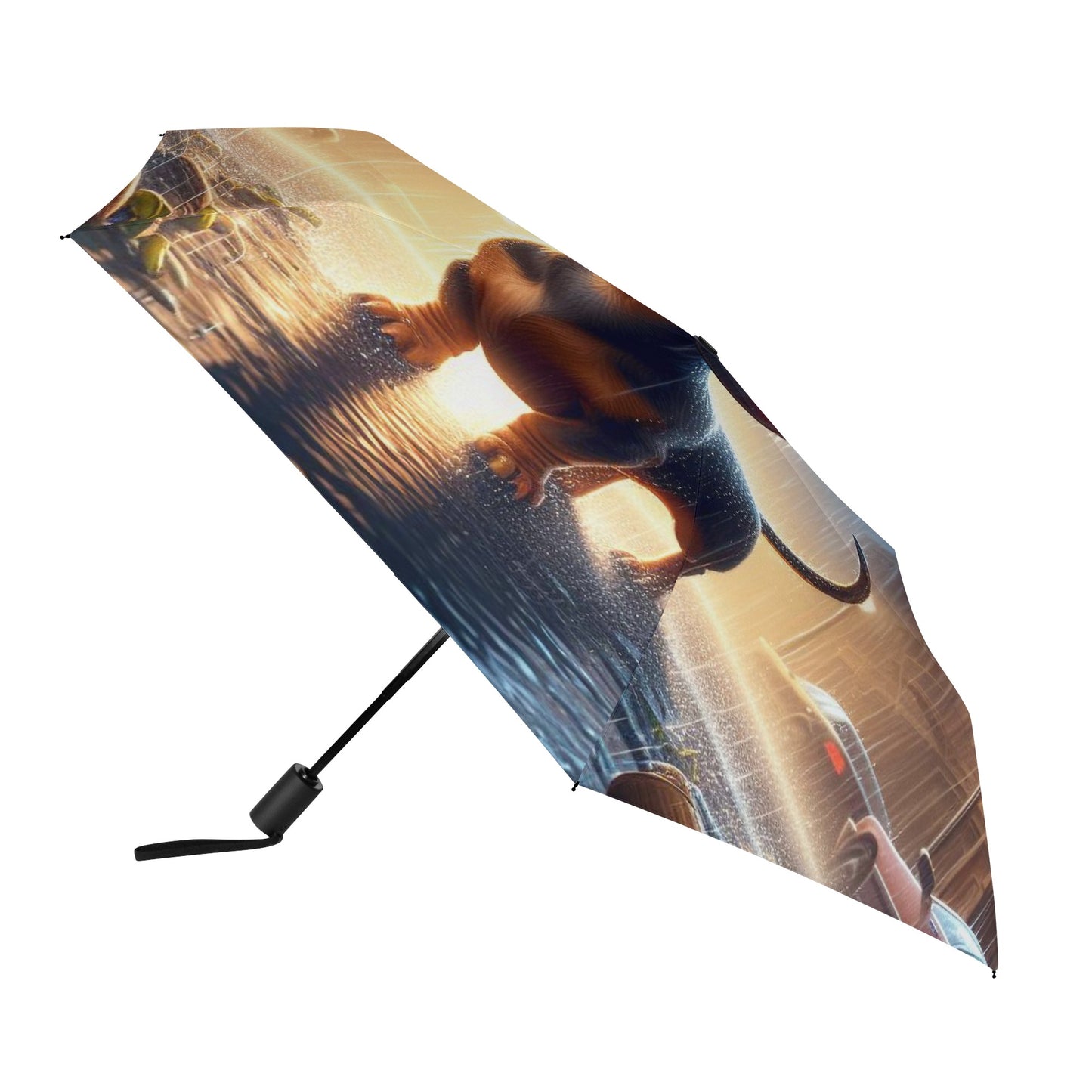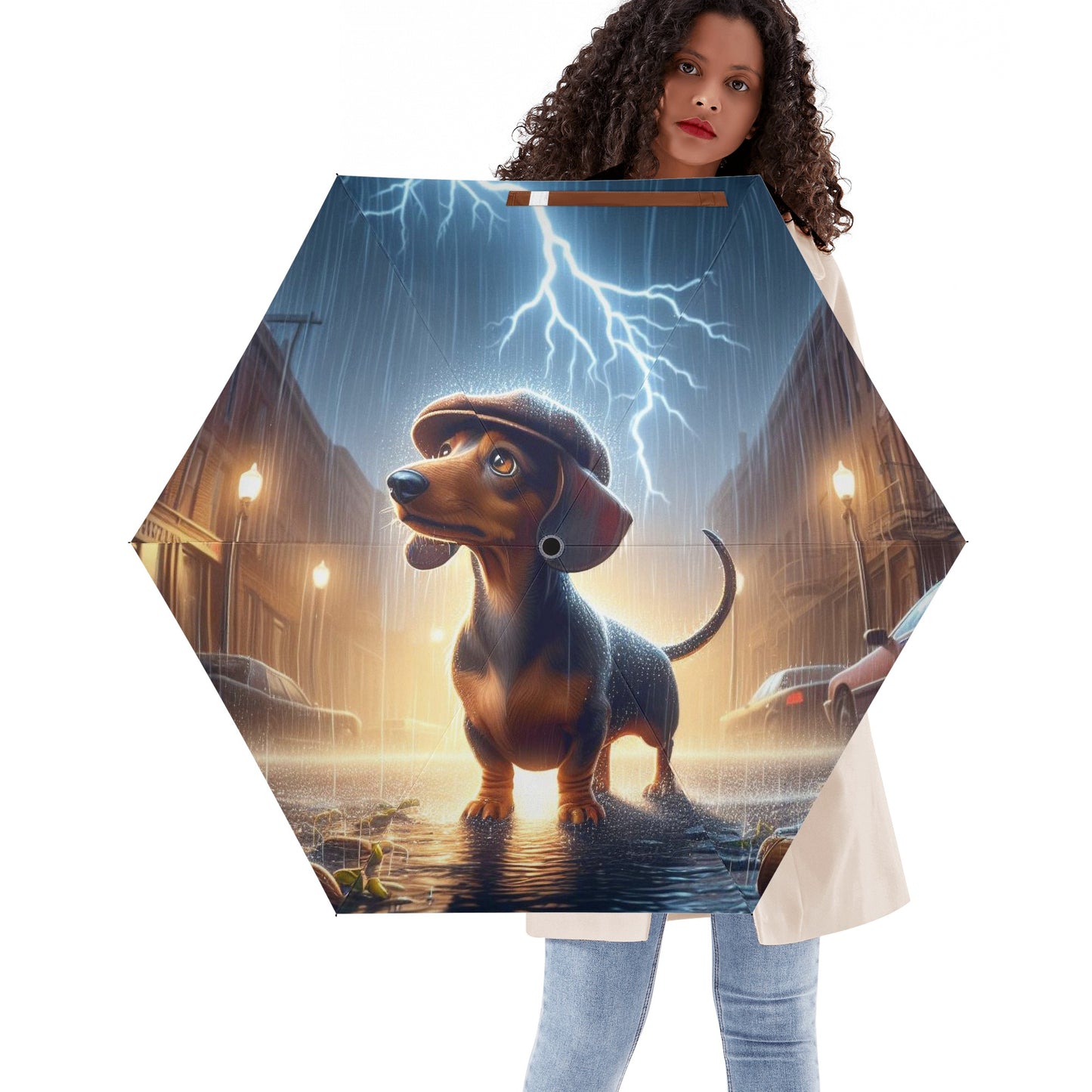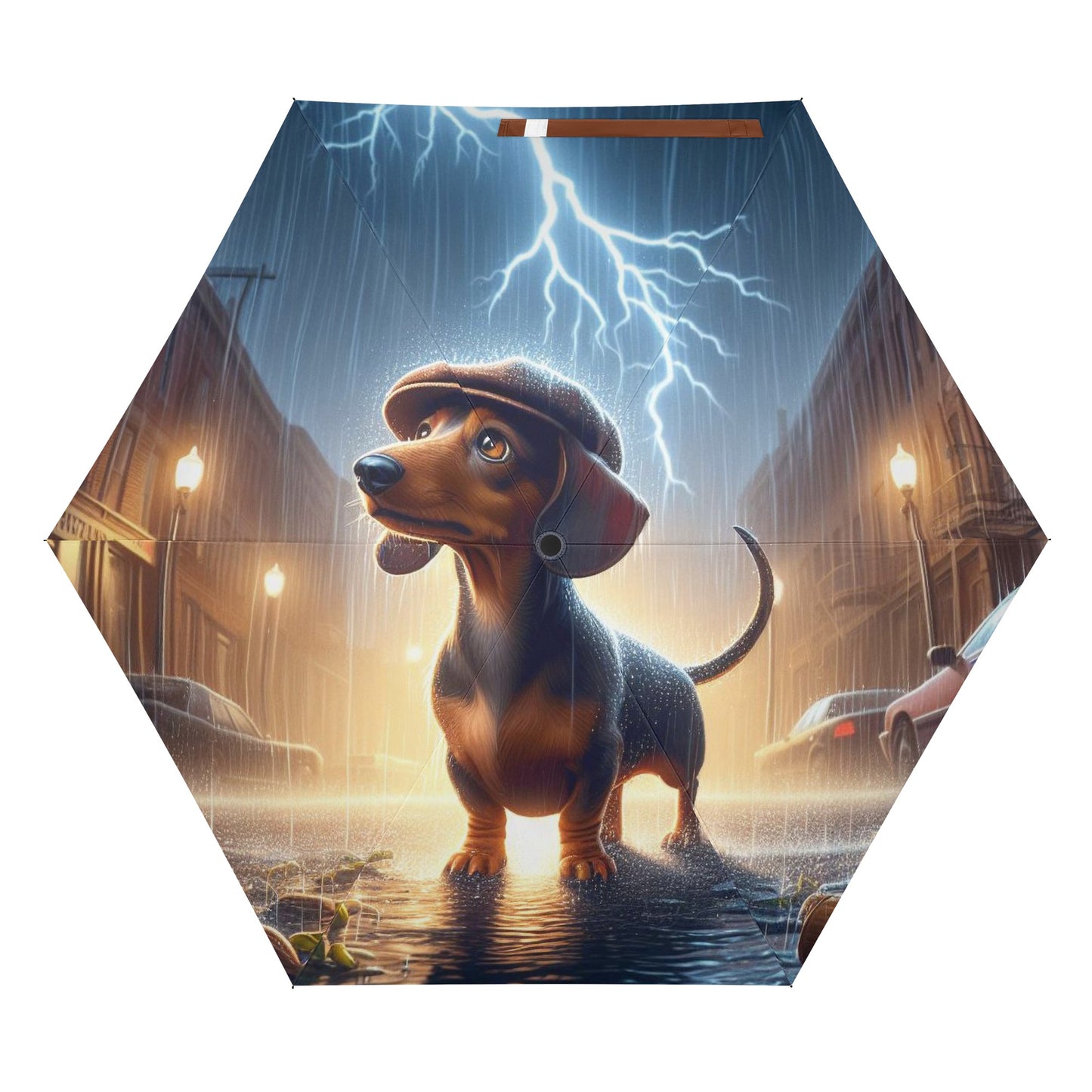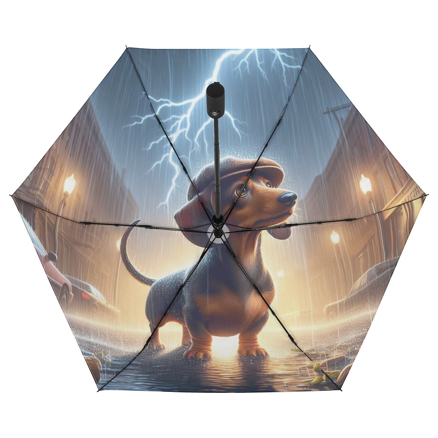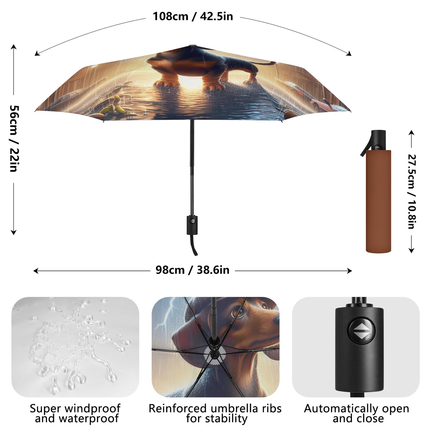The umbrella is made up of 6 pieces, each featuring a cute dachshund print. You can also customize the belt and cover to match your style and preference. The umbrella has an automatic open and close mechanism, and a comfortable grip handle. You can open and close it with one hand, and enjoy a smooth and convenient experience.