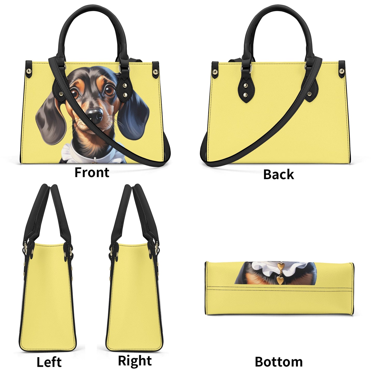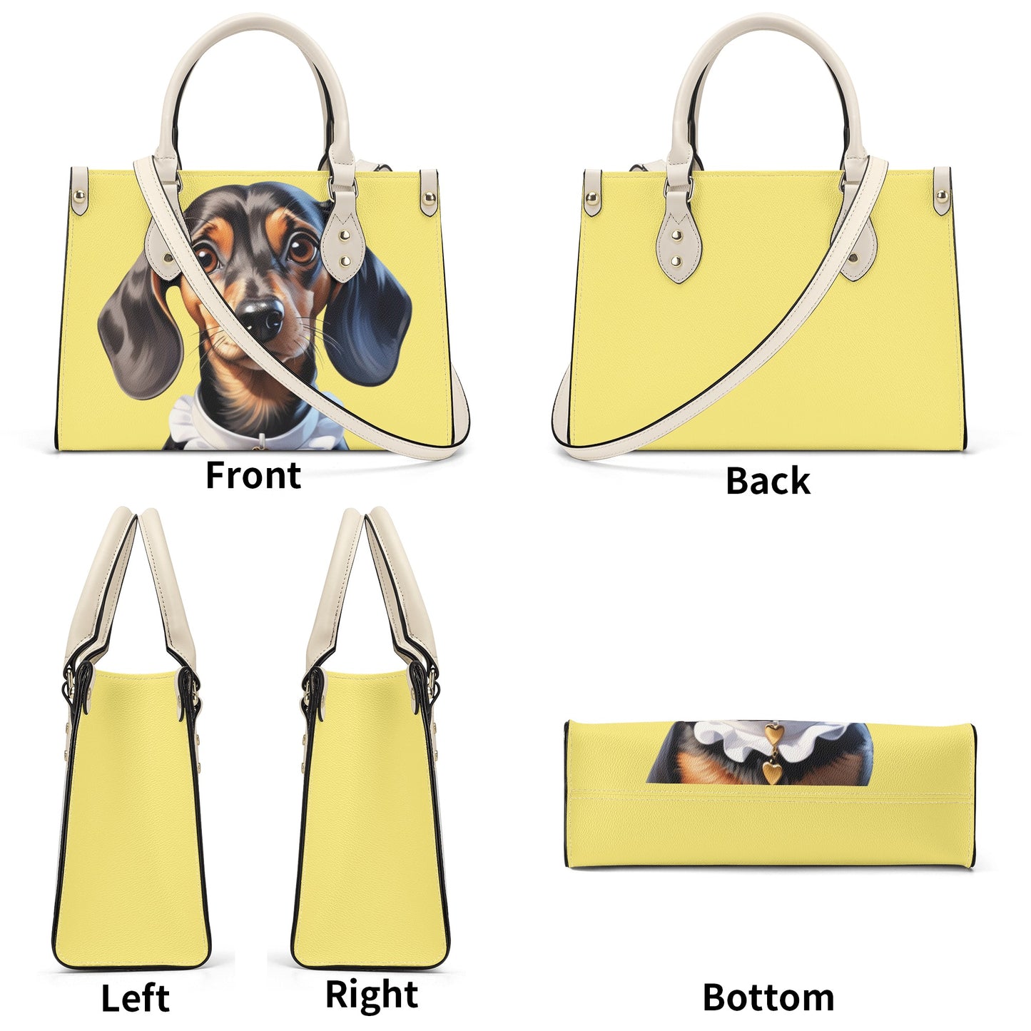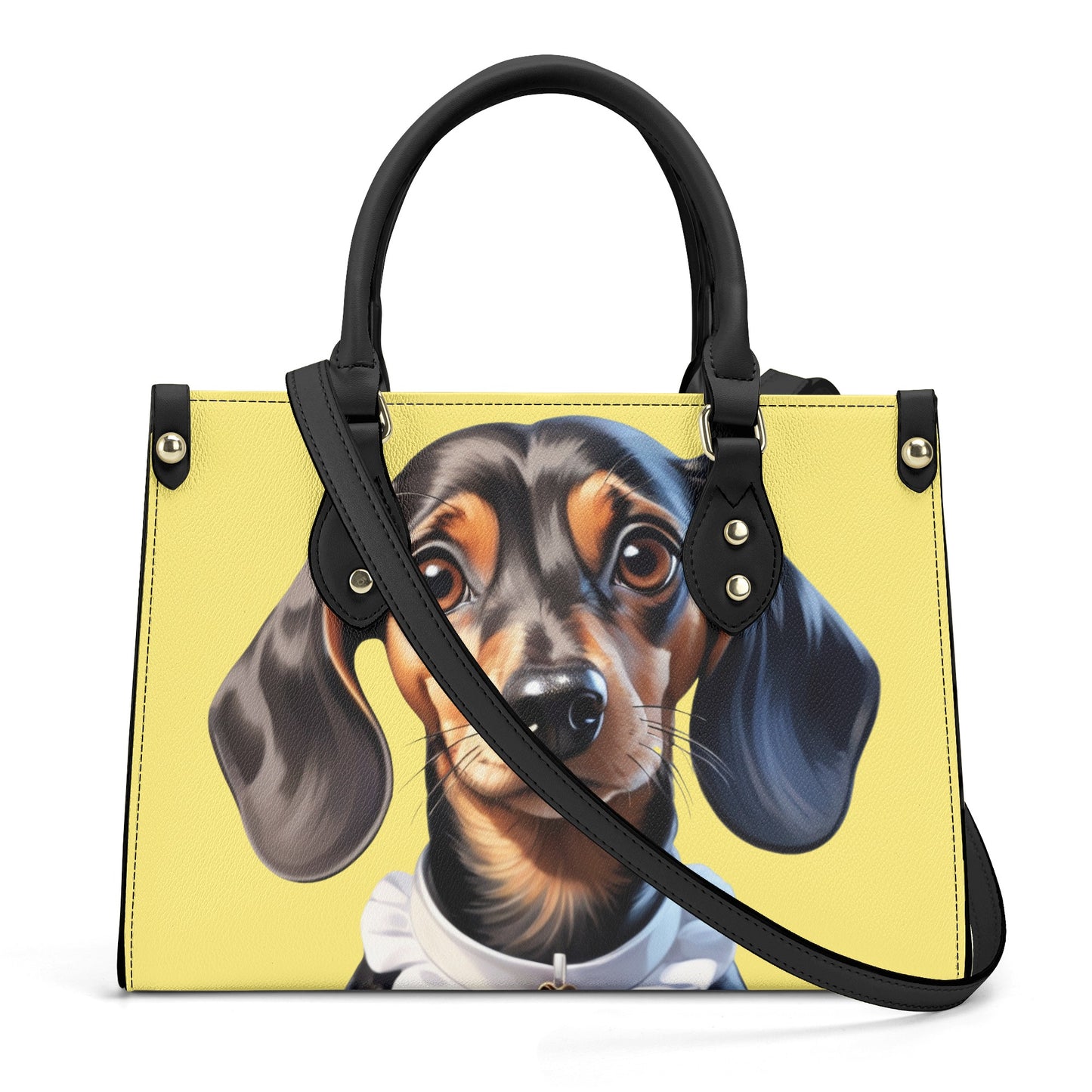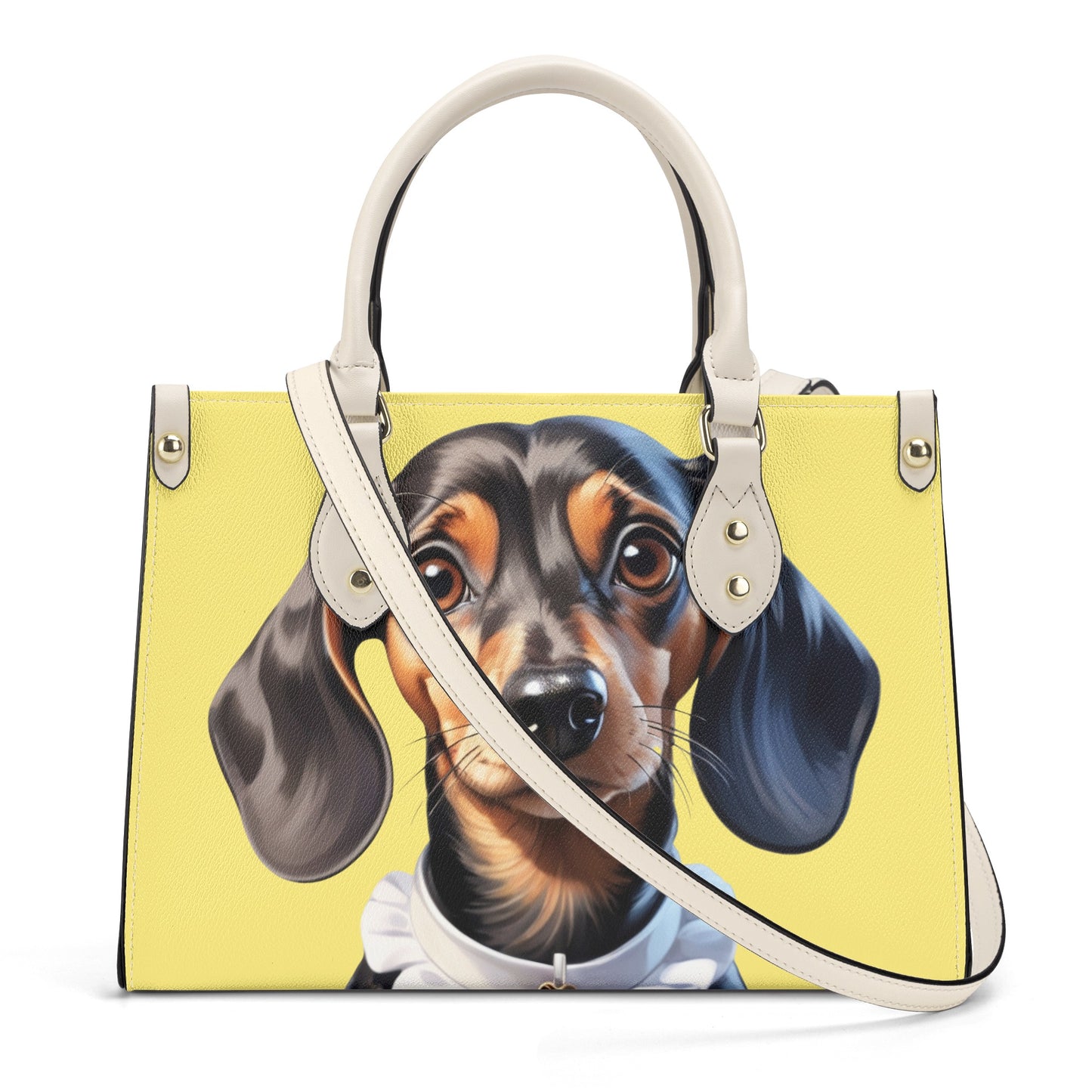 - This handbag is made of high-quality PU leather, which is durable, water-resistant, and easy to clean. It features a smooth zipper and an all over printing customized style, with a charming dachshund pattern that will make you smile every time you look at it. The main compartment design with two top handles maintains balance and allows you to carry your essentials with ease. The handbag also has one inside pocket with a sewn-in and non-removable shoulder strap, which gives you more options to wear it as a crossbody or a shoulder bag. The white and black color scheme is versatile and elegant, and it can match different outfits and occasions.