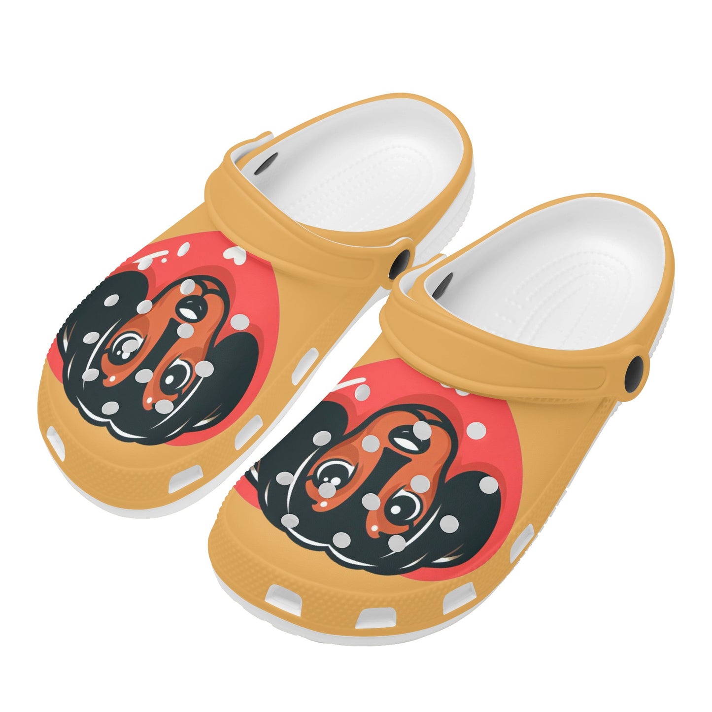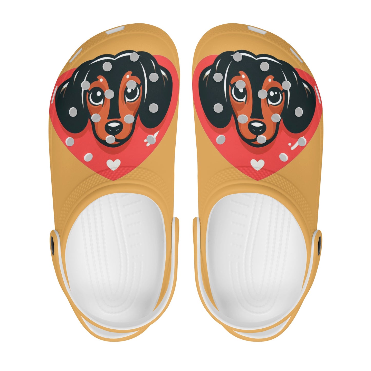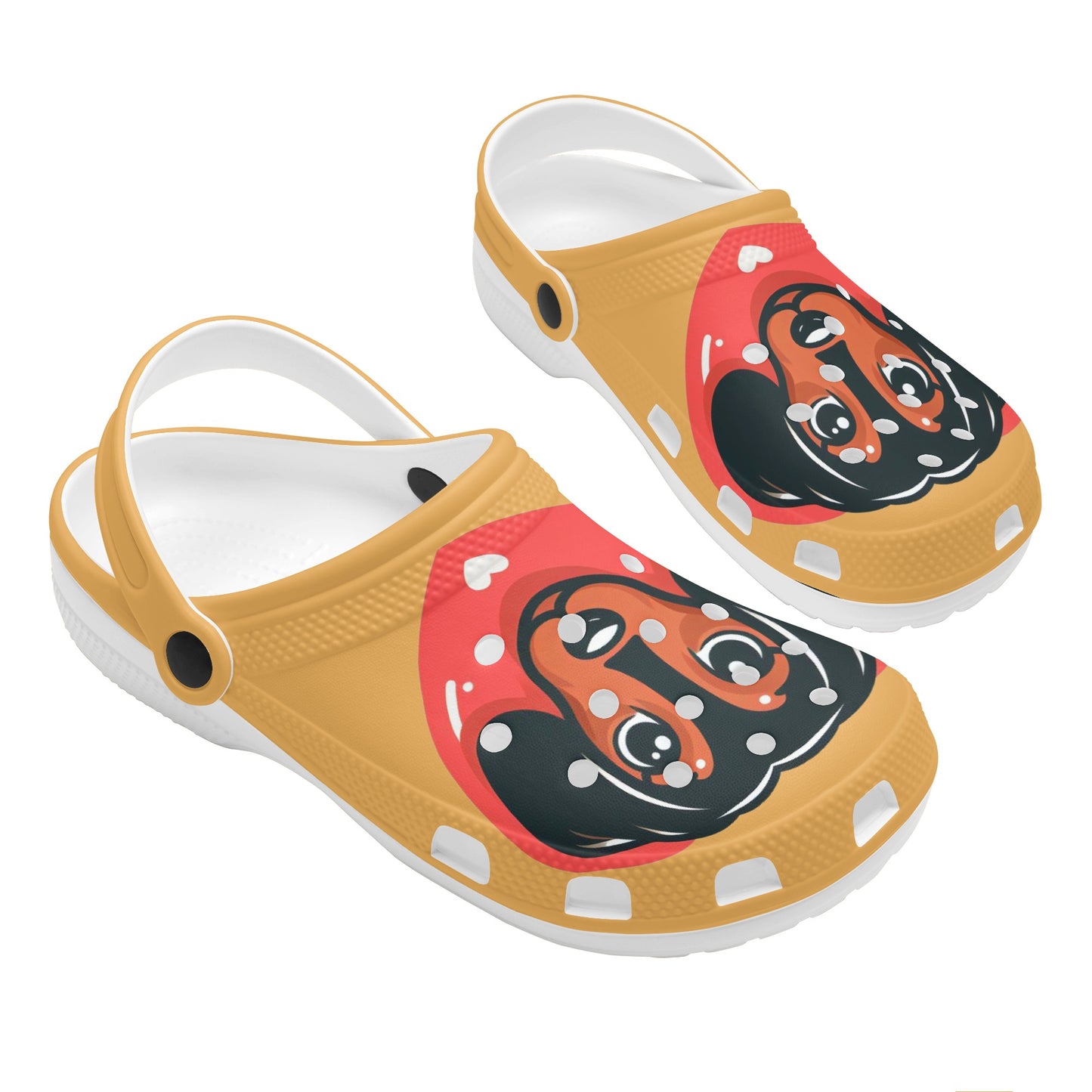 If you are a dachshund lover, you will adore these custom all over printed clogs that feature charming dachshund images. These clogs are not only fashionable, but also comfortable and functional. They are made of high quality EVA material that is flexible and durable, and they have a rounded style and vent holes for added fun and breathability. The pivoting heel strap allows you to easily slip them on and off, and also provides a more secure fit. The sublimation printing technique ensures vibrant colors and creative ideas that will make your clogs stand out. Whether you wear them at home, at the garden, or at work, these clogs will keep your feet cozy and your dachshund love strong. To keep them in good condition, simply hand wash them in cold water and air dry them. Order yours today and enjoy the compliments from fellow dachshund fans!